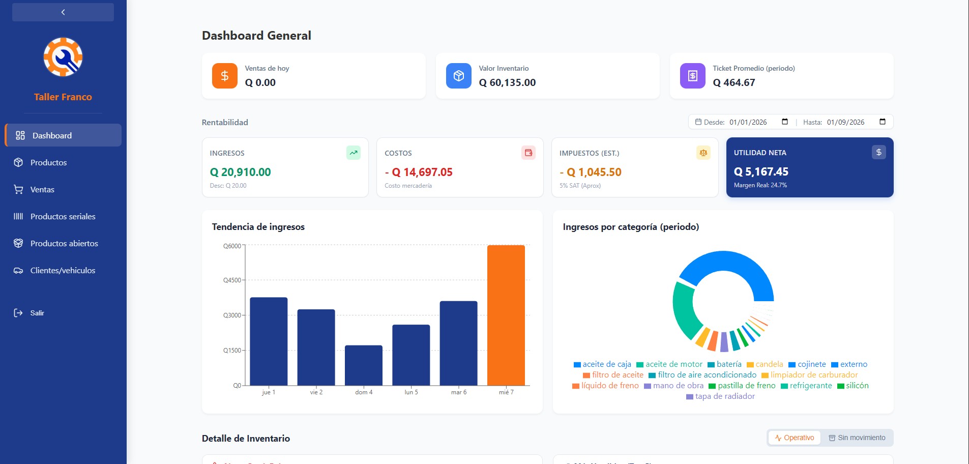Development of a comprehensive platform for inventory and sales management in a real commercial environment for an auto parts workshop and sales company; I designed a complex inventory system segmented by product type (units, bulk/liquids), a real-time sales dashboard, robust authentication system and route protection for different users. All of the technologies that I used are: